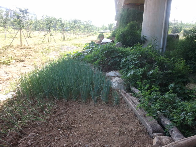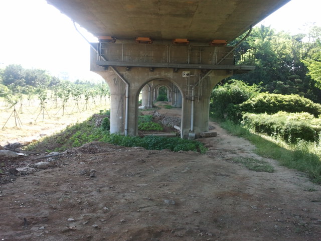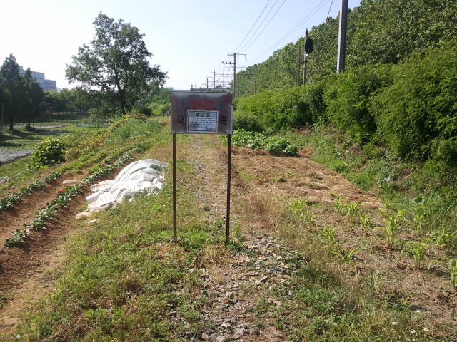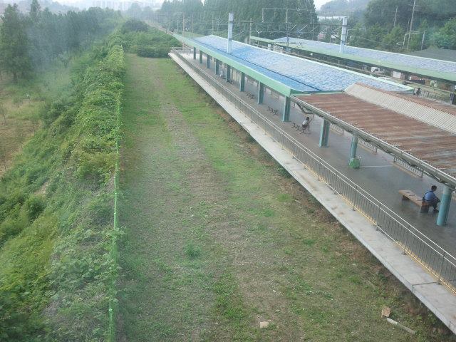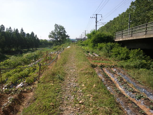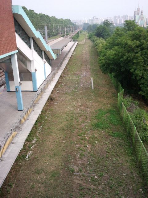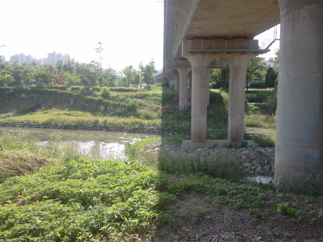 The old line next to the new line. In the distance the concrete of Handaeap Station (한대앞역) can be seen. The rails are gone here.Unfortunately just before Handaeap Station (한대앞역) a sign says you are entering station area, it is illegal to go on here. I noticed it would be possible to walk all the way to the station, but I didn’t want to end up in trouble…View towards Handaeap Station (한대앞역), the station area sign is one meter to the back. The trains on line 4 are easily recognizable by their light blue paint scheme.At Handaeap Station (한대앞역) the track bed can still be seen, even part of the old narrow gauge platform seems to be still there in the distance. Some sleepers can be seen close to the current building.Also at Handaeap Station (한대앞역), but then view towards the west. There is no track bed left amongst the trees in the back ground and until close to Jungang Station (중앙역) nothing can be found. Here it seems that a large mount was created next to line 4 (southern side of embankment), it could be that this was a waste disposal dump.View west right under the line 4 elevated line, near Jungang Station (중앙역). The Hanggaul Road (항가울로) is behind me, Jungang Station (중앙역) in front. Here it is possible to walk under the line between stations, there are no fences at all.Some remnants of the narrow gauge line can be found here, like sleepers, but nothing more than that.Just before Jungang Station (중앙역) a small river crosses the old line. No old bridge is here, not even some parts on the embankment. It might be that this is actually a canal, built after 1995. There are a few more of these canals in Ansan.