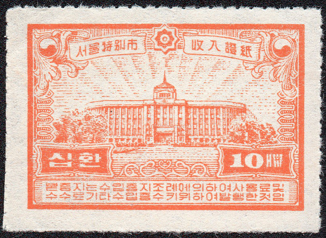 Seoul local revenue, 10 hwan, orange, rouletted, 1950s-1962. The 10 hwan value from the hwan values series in use between the early 1950s and 1962 within the Seoul area.
